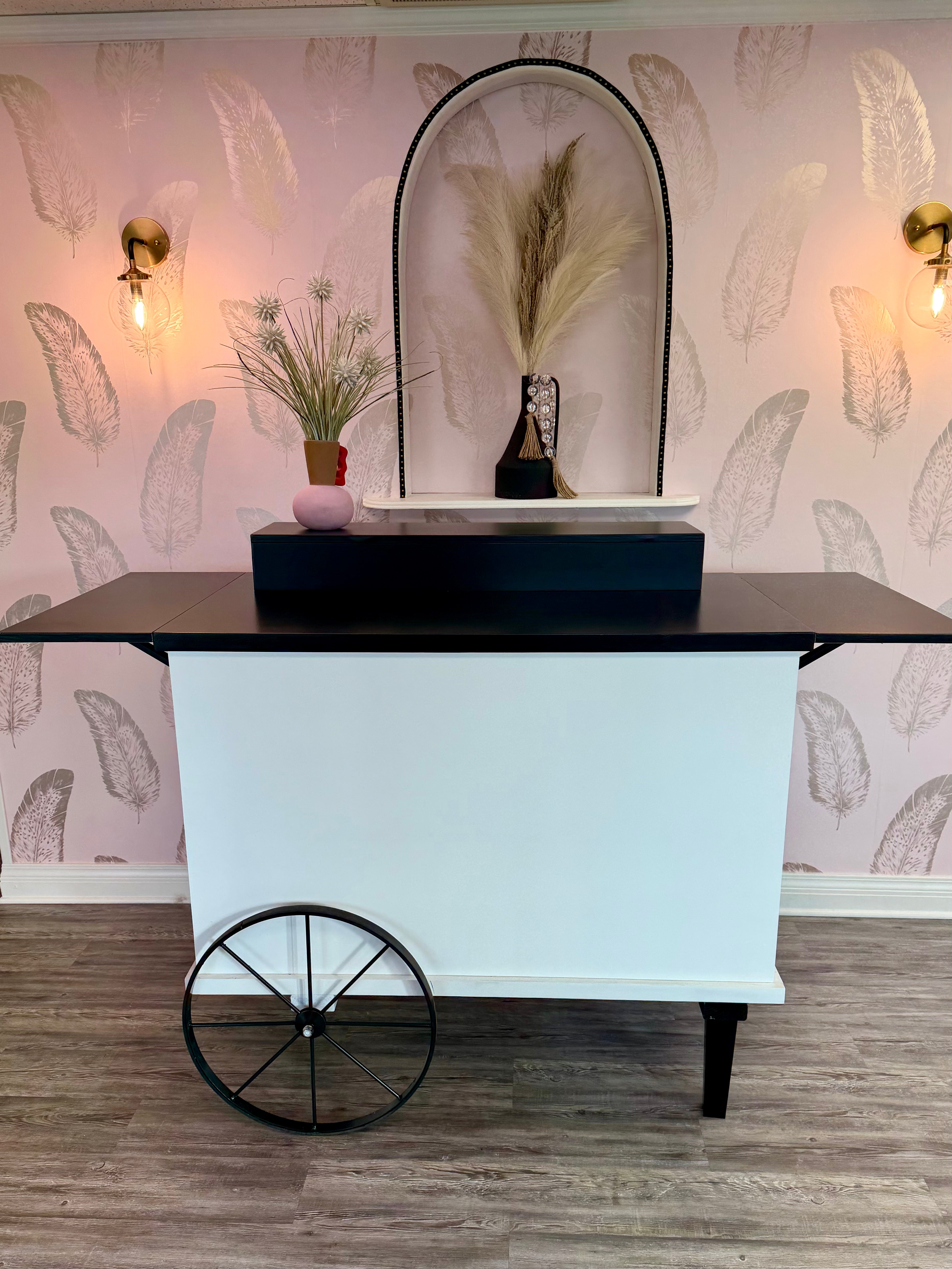 Our Lux Cart features a sleek black-and-white design, created specifically for weddings and elevated events. It’s perfect for showcasing your wedding cake, or styling gifts and favors in a way that feels intentional, polished, and unforgettable.